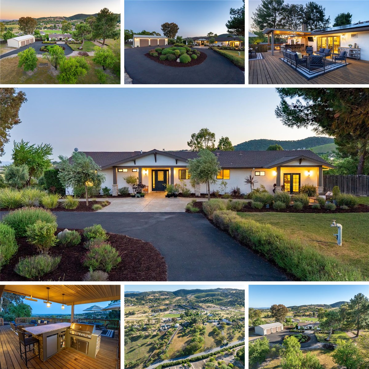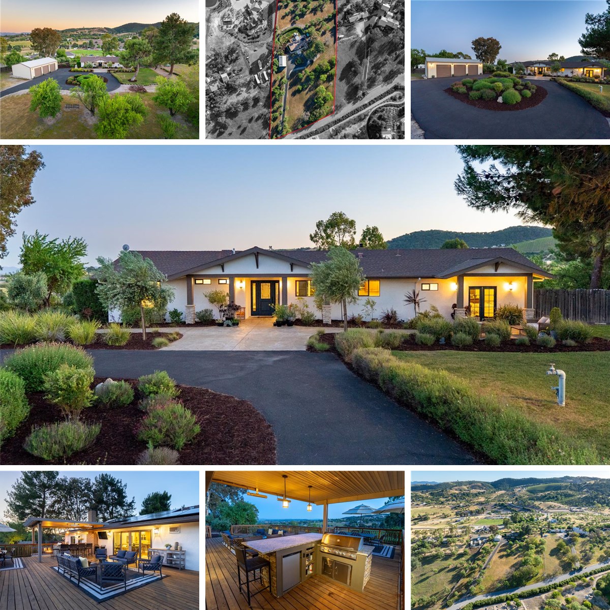 Resting on nearly four rolling acres and set in the middle of gorgeous almond trees, this fantastically remodeled luxury residence is a rare offering that blends refined living with the beauty of the natural landscape — all just a couple of minutes from town. Situated in one of Paso Robles' most coveted westside cul-de-sac locations, you will enjoy the sweeping circular driveway that sets the tone with lush landscaping and a welcoming entry that hints at the quality within. Inside, warm bamboo floors and a stunning real-stone surround gas fireplace anchor the main living space, while a climate-controlled wine closet and a versatile flex room — perfect as a private library or music retreat — speak to thoughtful, sophisticated design. The home flows effortlessly to the massive newer redwood deck engineered for effortless entertaining, complete with a built-in barbecue complete with seating, refrigerator, ambient lighting, and heaters — all framed by breathtaking panoramic views that stretch across the surrounding countryside. The layout of the home features two generous primary suites, a third bedroom, and a full bath. The main primary is luxurious and privately located on a separate wing of the home and has a private attached patio and spa-like bathroom. The chef-appointed kitchen shines with stainless KitchenAid appliances, warm updated warm cabinetry and rich granite countertops. Nearly every system and surface has been extensively updated. A fully owned solar system with 30 panels, installed in 2021, conveys with the property. Outside, the beautifully curated grounds offer stamped concrete hardscape, multiple patios, a fire pit, a handmade plunge pool, and automated landscape irrigation — all designed for low-maintenance enjoyment of this spectacular setting. Completing the package is an approximately 1,350 sq ft shop with three oversized roll-up doors — ideal for the hobbyist, car enthusiast, contractor, or anyone needing flexible workspace. This is more than a home — it’s a lifestyle.