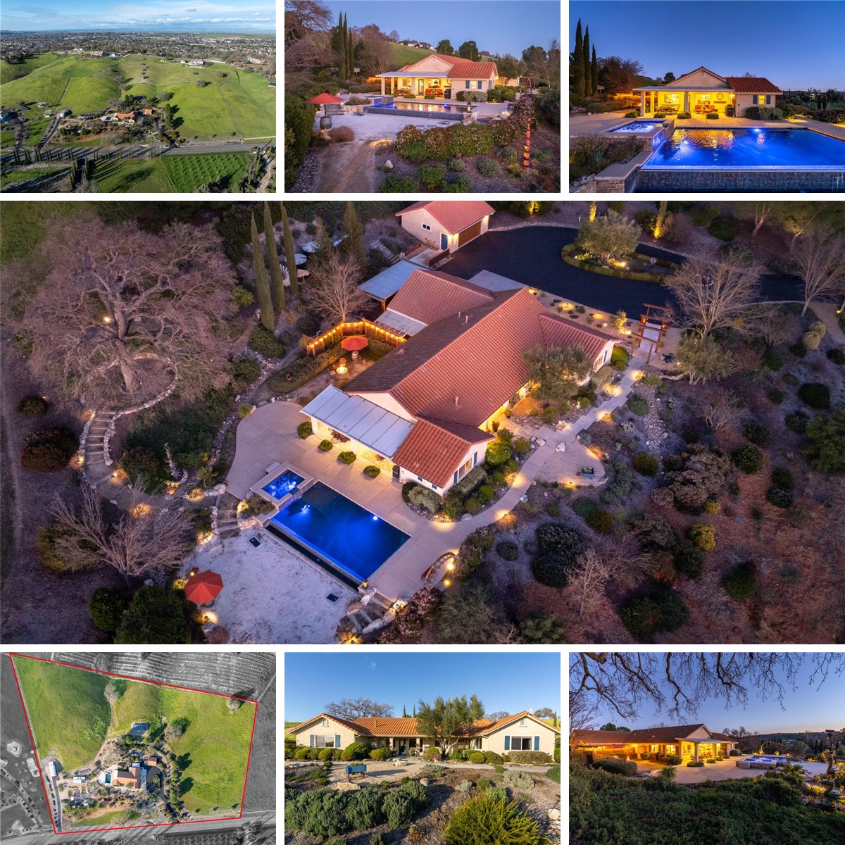 Welcome to Casa de Robles in the highly desirable Spanish Camp area of Paso Robles, an extraordinary private retreat set on seven gently rolling, fully deer-fenced acres behind an electronic gate with a circular driveway. This beautifully remodeled estate, which is just minutes to charming downtown, blends modern efficiency with refined luxury and offers unforgettable sweeping views. Entering this single-level home you will love the vaulted exposed wood ceilings, tile floors, a custom barn door which artfully hides the included TV, and a custom Mendota fireplace with real Adelaida stone. Notably there are no stairs or steps into or out of the home. A fully owned solar system, newer HVAC, high production well, and cleared septic and pest inspections offer true peace of mind. The stunning chef kitchen features live-edge stone countertops, double ovens, open shelving, a walk-in pantry, dedicated coffee station, and an impressive 132-bottle Sub-Zero wine refrigerator, creating the perfect space for entertaining. The spacious primary suite is a serene escape with a spa-inspired bath and expansive walk-in closet, while a whole-house Hague water filtration system enhances everyday living. Each bedroom has a dedicated bathroom. Outdoors, the infinity-edge pool with spa spillover takes center stage, complete with electronic child safety barrier and both gas and passive solar heating options and situated perfectly to take in the stunning view and is just steps away from the covered patio with electronic awning and fans. Ideal for hobbyists or collectors, the property which has covered parking for 5 vehicles plus RV, includes a 2½-car attached garage with polyaspartic flooring and custom storage, a detached two-car shop with heat and air and a dust collection system, and a substantial steel RV building with its own private access road and gated entry. Garden enthusiasts will appreciate ten raised beds, pergola, fire bowl, low-v landscape lighting, bocce ball area, a massive garden shed with sink and work stations, and the thoughtfully designed landscaping with auto-drip along with majestic oak trees, while charming touches like a vintage 1960 Shasta trailer playhouse and landscape art adds character and warmth to this truly one-of-a-kind Paso Robles estate. No HOA.Contact Terri Winn of GUIDE Real Estate at 805-610-0991 for a private viewing.